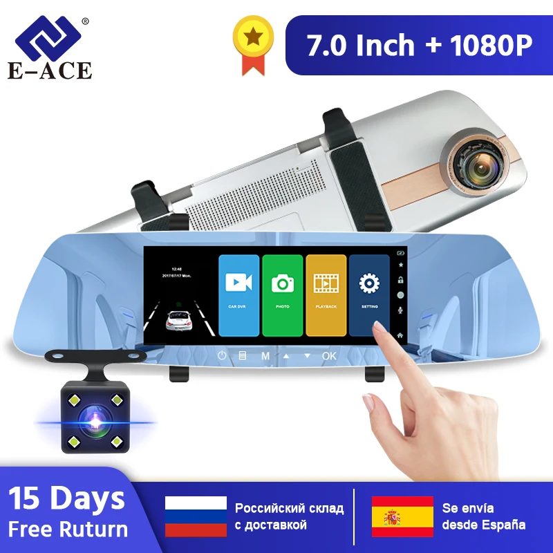 E-ACE Car Dvr 7.0 Inch Rearview Mirror FHD 1080P DashCam Dual Lens Video Recorder Night Vision Auto